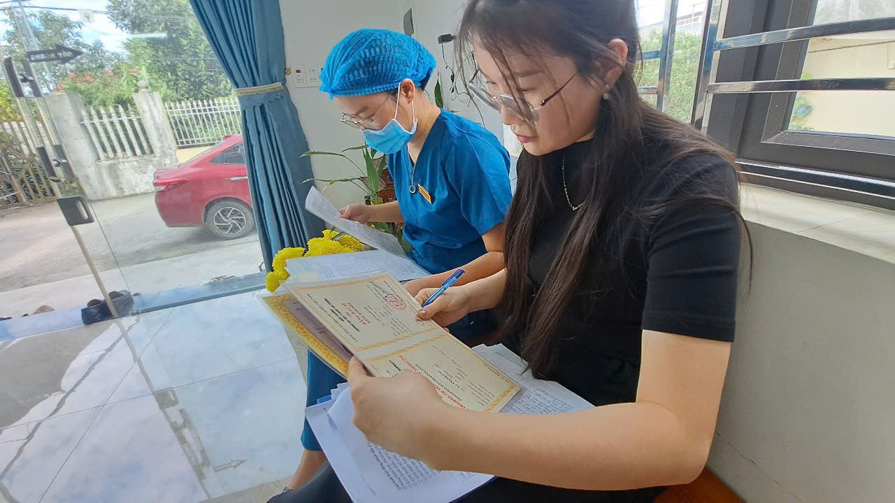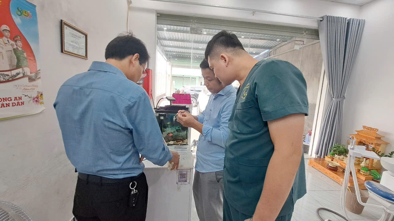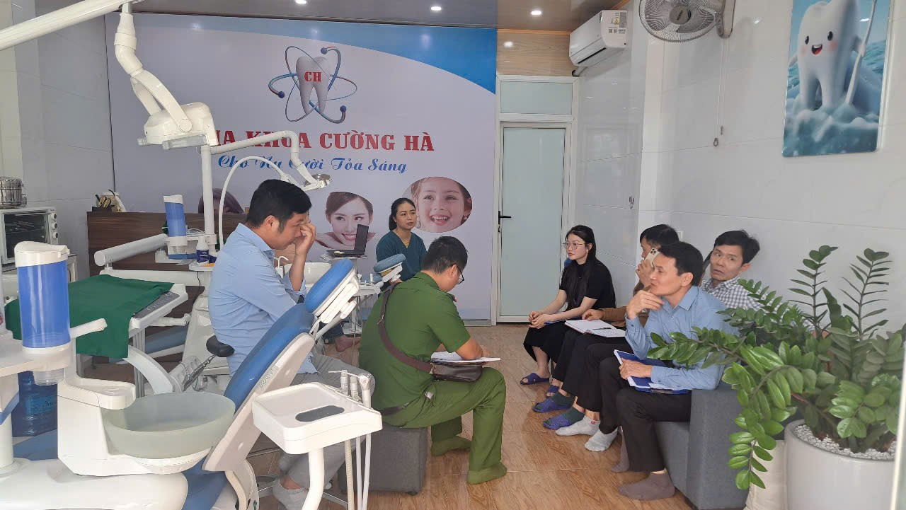 Thành viên đoàn kiểm tra xã An Trường kiểm tra thực tế tại một cơ sở nha khoa trên địa bàn, rà soát trang thiết bị, thuốc và vật tư y tế phục vụ khám chữa bệnh, đảm bảo tuân thủ quy định hành nghề y tư nhân năm 2025.